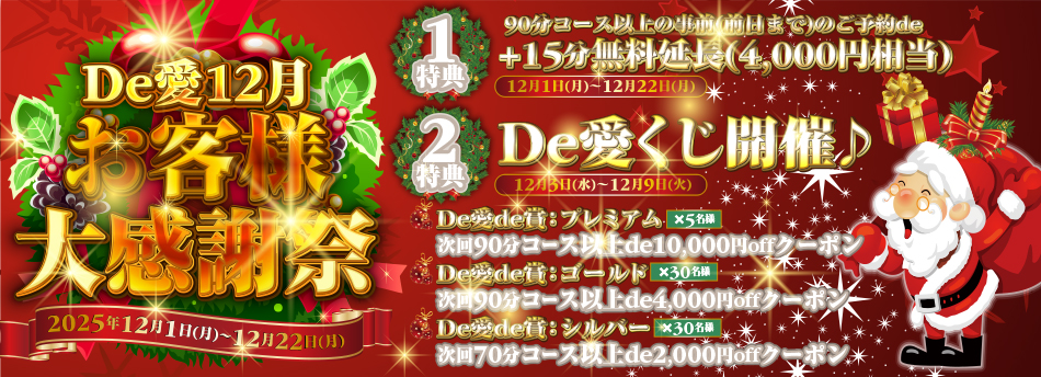 特典:90分コース以上の事前(前日まで)のご予約de+15分無料延長(4000円相当)